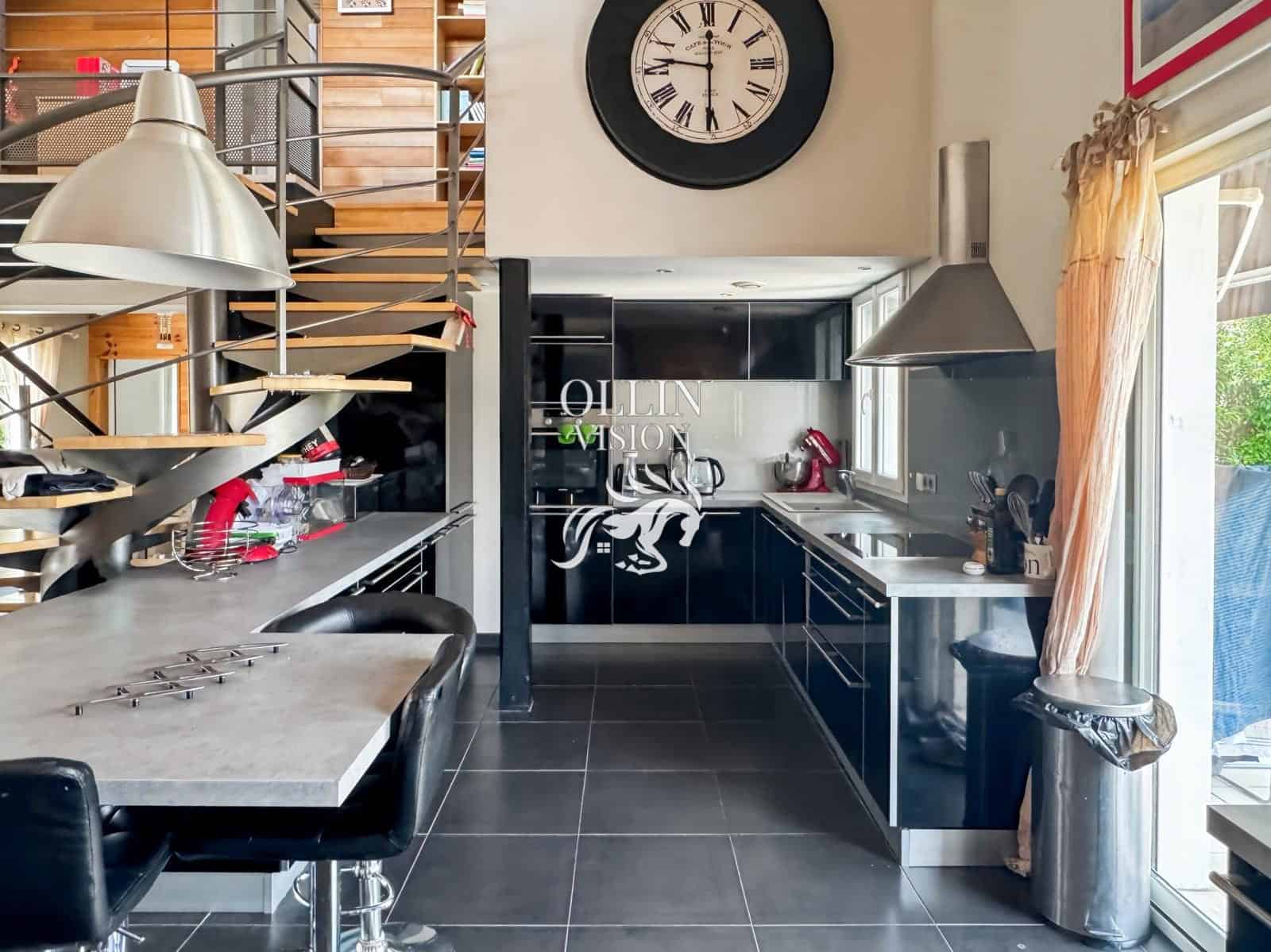 Elle se compose d’un vaste double séjour baigné de lumière, avec plafond cathédrale et poêle à bois, ouvert sur une cuisine moderne entièrement équipée.