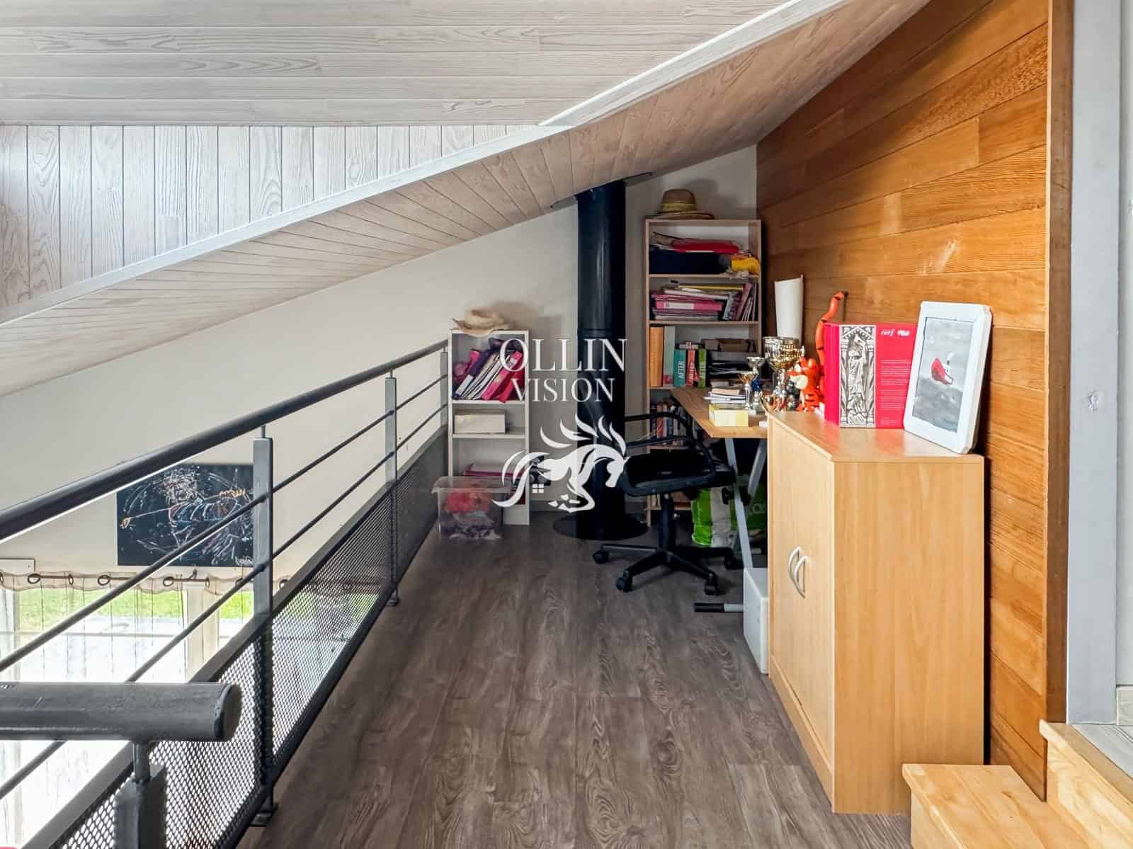 À l’étage : une mezzanine aménagée en bureau, deux grandes chambres, une salle d’eau et un WC indépendant.